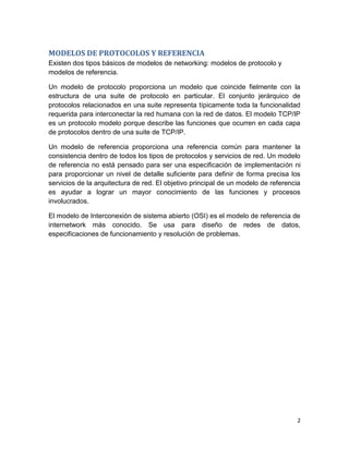 Este documento describe el modelo OSI de 7 capas y cómo se compara con el modelo TCP/IP. Explica que el modelo OSI fue desarrollado por la ISO como un marco de referencia para redes abiertas, mientras que TCP/IP es un modelo de protocolo que describe la arquitectura de protocolos de Internet. Aunque pocos protocolos OSI se usan hoy en día, el modelo de 7 capas ha contribuido al desarrollo de otros protocolos y productos de red.