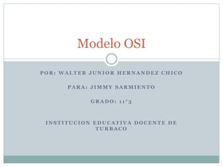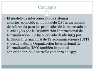 El documento describe el modelo OSI (Open Systems Interconnection), un modelo de referencia para protocolos de red creado en 1980. Consta de 7 capas que definen los niveles de comunicación, desde la capa física hasta la capa de aplicación. Cada capa se encarga de un aspecto específico de la transmisión y recepción de datos a través de una red.