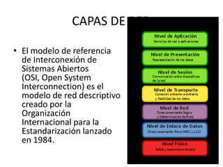 El documento describe las 7 capas del modelo OSI de referencia para redes de comunicaciones. Cada capa se encarga de funciones específicas como la transmisión física de datos, el direccionamiento de hardware, el enrutamiento lógico de paquetes, el transporte fiable de datos, el control de sesiones, la representación común de la información y los protocolos de aplicaciones. Juntas, las 7 capas del modelo OSI permiten la comunicación de datos entre dispositivos de red de manera estructurada y estandarizada.