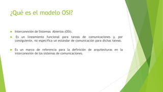 El modelo OSI divide el proceso de transmisión de información entre equipos informáticos en 7 capas, donde cada capa se encarga de una parte del proceso global. La capa física convierte los datos a una secuencia de bits para transmitir por el medio físico, mientras que la capa de enlace de datos organiza los bits en grupos lógicos. La capa de red determina la ruta de los paquetes y convierte las direcciones lógicas a físicas.