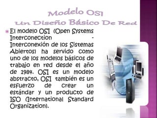 El documento describe el modelo OSI de 7 capas para redes de computadoras. Explica cada una de las 7 capas del modelo OSI (física, enlace de datos, red, transporte, sesión, presentación y aplicación) y sus funciones. También compara brevemente el modelo OSI con el modelo TCP/IP, señalando algunas de sus diferencias. Por último, proporciona detalles sobre las normas Ethernet 10 BASE-T y 100 BASE-TX.