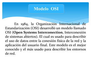 El modelo OSI define un marco de referencia de 7 capas para la comunicación de datos entre sistemas abiertos. Cada capa se encarga de una función específica como la transmisión física de bits, el enrutamiento de paquetes, el transporte fiable de datos y servicios para aplicaciones. El modelo OSI sigue siendo ampliamente utilizado hoy en día para guiar el diseño de redes y la normalización de protocolos.