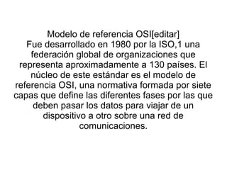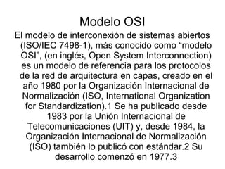 El modelo OSI es un modelo de referencia para protocolos de red creado en 1980 por la ISO. Consta de 7 capas que definen las fases por las que los datos pasan de un dispositivo a otro en una red. La capa física se encarga de la transmisión de bits a través del medio físico. La capa de enlace de datos gestiona el direccionamiento físico, detección de errores y flujo de tramas. La capa de red identifica el enrutamiento entre redes y la capa de transporte transporta los datos de manera independiente de la red