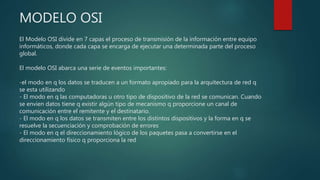 El Modelo OSI divide el proceso de transmisión de información entre equipos informáticos en 7 capas, donde cada capa se encarga de una parte del proceso. La capa física se encarga de los aspectos físicos como cables y la capa de aplicación proporciona la interfaz del usuario. El modelo garantiza que los datos se transmitan de forma fiable entre dispositivos a través de la traducción, transmisión, direccionamiento y comprobación de errores realizadas por las distintas capas.