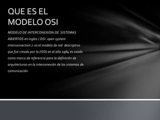 El documento describe el Modelo OSI, un modelo de referencia para la interconexión de sistemas de comunicación creado por la ISO en 1984. El Modelo OSI consta de 7 capas que gestionan diferentes aspectos de la comunicación de red, desde la capa física en la parte inferior que se encarga de la transmisión de datos, hasta la capa de aplicación en la parte superior que ofrece servicios a las aplicaciones.
