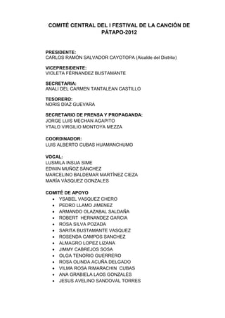 Este documento describe el Primer Festival de la Canción a Nivel Nacional organizado por la Municipalidad Distrital de Pátapo en 2012. Tuvo como objetivo promover la cultura musical y el turismo en la región. Se invitó a compositores e intérpretes a enviar canciones inéditas para la preselección. 30 canciones fueron seleccionadas para participar en el festival de 3 días. Los participantes recibirían alojamiento y comidas. Se formó un comité organizador y jurados calificadores evaluarían las presentaciones para elegir a los ganadores