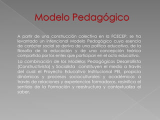 1. El modelo pedagógico de la FCECEP combina enfoques constructivistas, socialistas y cognitivos para formar sujetos autónomos, conscientes y capaces de crear cambios sociales.