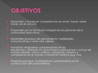El documento describe el modelo pedagógico santanderista, el cual busca desarrollar competencias en los estudiantes a través de procesos de pensamiento, comunicación y valores. El modelo se enfoca en la formación integral de las personas y la construcción del conocimiento a partir de procesos investigativos y participativos.