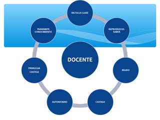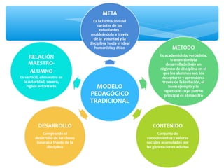 El documento describe los elementos clave del modelo pedagógico tradicional, incluyendo: i) El maestro es el centro del proceso de enseñanza y aprendizaje y transmite información a los estudiantes; ii) Se enfoca en la formación del carácter de los estudiantes a través de una relación vertical y autoritaria; iii) El aprendizaje es memorístico y se mide a través de evaluaciones.