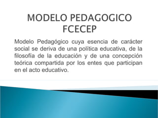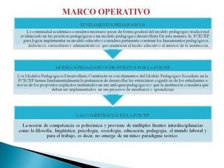 El documento presenta la misión, visión y marco general del Proyecto Educativo Institucional de la Fundación Centro Colombiano de Estudios Profesionales FCECEP. Su misión es formar sujetos comprometidos con su desarrollo personal y laboral capaces de liderar procesos de transformación social. Su visión es posicionarse como institución de educación superior técnica, tecnológica y universitaria, acreditada para el 2017. El marco general describe los principios, políticas y características del PEI, incluyendo calidad ac