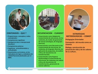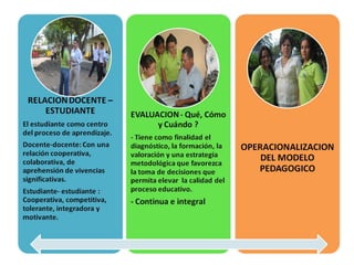 El documento describe el modelo pedagógico constructivista social y dialogante de la Institución Educativa "Cecilia de Lleras". El modelo busca definir los roles del docente y el estudiante, las metodologías de enseñanza y aprendizaje apropiadas, y cómo debe entenderse el conocimiento y la evaluación dentro del proceso formativo. El modelo se basa en el constructivismo social y enfatiza las relaciones entre el conocimiento, el docente y el estudiante.