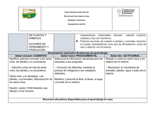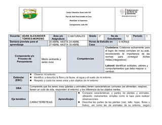Este documento presenta el plan de aula para el estudio en casa de Ciencias Naturales para el grado 3° en el Centro Educativo Rural León XIII. El plan incluye información sobre el área, los estudiantes, las competencias, los estándares, los aprendizajes esperados, los temas y las estrategias metodológicas. El plan se llevará a cabo del 20 al 24 de abril y del 27 al 30 de abril con 5 horas de estudio en casa debido a la falta de acceso virtual de los estudiantes.