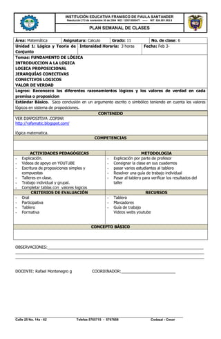 Este documento presenta el plan de estudios para una clase de matemáticas sobre lógica y teoría de conjuntos para el grado 11. La clase cubrirá fundamentos de lógica, lógica proposicional, conectivos lógicos y valores de verdad. Las actividades incluyen explicaciones del profesor, videos educativos, trabajos individuales y grupales para practicar proposiciones y valores lógicos. La evaluación será oral, participativa y formativa utilizando el tablero y guías de trabajo.