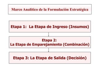 El documento presenta un modelo de gerencia estratégica que incluye cinco etapas: 1) establecimiento de la visión y misión, 2) determinación de objetivos y estrategias a largo plazo, 3) implementación de estrategias a corto plazo, recursos y políticas, 4) revisión estratégica, y 5) control. También describe las evaluaciones interna y externa, y el uso de matrices como FODA para formular cuatro tipos de estrategias que aprovechen fortalezas y oportunidades, superen debilidades