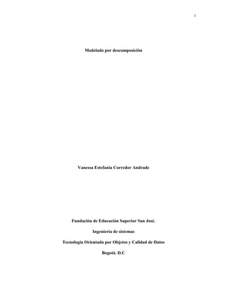 Este documento describe el modelado por descomposición y análisis y diseño orientado a objetos. Explica cómo descomponer un problema en objetos en lugar de acciones y cómo crear modelos de objetos que interactúan usando notación como UML. Luego proporciona ejemplos de cómo aplicar patrones de diseño como polimorfismo, factorías e inversión de control para diseñar una aplicación bancaria que muestre movimientos de clientes.