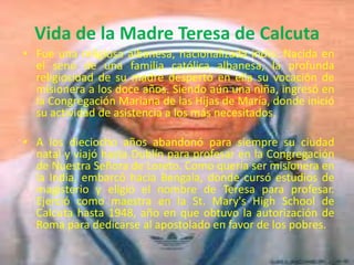 La Madre Teresa de Calcuta fue una religiosa albanesa que dedicó su vida a ayudar a los más pobres en la India. Fundó la Congregación de las Misioneras de la Caridad y recibió premios como el Premio Nobel de la Paz por su labor humanitaria. Sirvió como modelo positivo de fe, compasión y servicio a los demás.