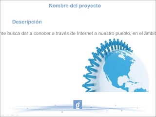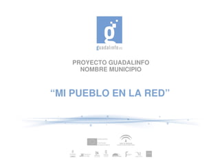 Este documento describe un proyecto llamado "Mi Pueblo en la Red" cuyo objetivo es mostrar el patrimonio, entidades y personajes significativos de un municipio a través de una página web y redes sociales. El proyecto implica al Centro Guadalinfo local y varias asociaciones, empresas y entidades del pueblo. Se desarrollará en cuatro fases: dar a conocer el proyecto, desarrollar las entidades en la web, implicar a las entidades subiendo contenido y revisar la viabilidad del proyecto a corto