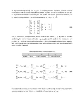 Este documento describe el modelo químico de Rössler, diseñado para estudiar reacciones químicas oscilantes. El modelo involucra tres ecuaciones diferenciales que describen las concentraciones de sustancias en la reacción. Para ciertos valores de los parámetros, el modelo exhibe comportamiento caótico sin alcanzar un estado estacionario. Adicionalmente, el documento analiza la linealización del modelo a través de la matriz jacobiana para predecir la estabilidad del sistema linealizado cerca del punto de equilibrio.