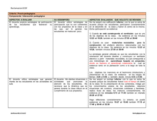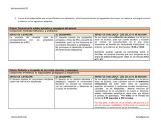 El docente solicita la revisión de su evaluación diagnóstica formativa debido a que no está de acuerdo con las calificaciones mínimas e inferiores que recibió en varios criterios. Argumenta que en el video se evidencian aspectos que demuestran un mejor desempeño del que fue calificado. También señala que no se tuvo en cuenta su planeación y que los comentarios de uno de los pares evaluadores contradicen las bajas calificaciones. Pide que se revisen nuevamente los criterios evaluados para recalificar adecuadamente su proceso de