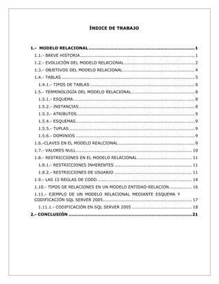 Este documento describe el modelo relacional de bases de datos. Explica brevemente la historia del modelo relacional y su evolución. Describe los objetivos, términos, tablas, claves, valores nulos y restricciones del modelo relacional. También presenta las 12 reglas de Codd y un ejemplo de modelado relacional mediante SQL Server 2005.