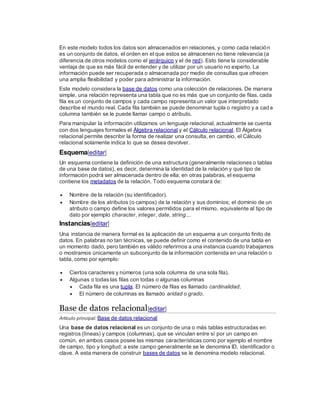 El modelo relacional es un modelo de base de datos basado en la lógica de predicados y la teoría de conjuntos. Sus ideas fundamentales son el uso de relaciones, que pueden considerarse como conjuntos de datos llamados tuplas. Este modelo es el más utilizado actualmente para modelar problemas reales y administrar datos dinámicamente.