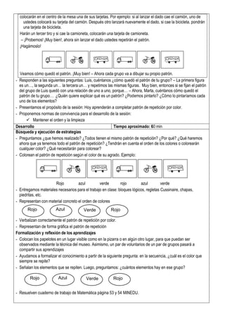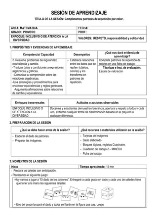 Este documento presenta una sesión de aprendizaje sobre completar patrones de repetición por color para estudiantes de primer grado. La sesión incluye actividades como jugar con un dado de patrones, dibujar y representar patrones con materiales concretos, y completar ejercicios en un cuaderno de trabajo. El objetivo es que los estudiantes aprendan a establecer relaciones entre datos que se repiten y transformarlos en patrones de repetición.