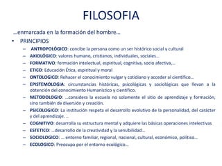 El documento describe la filosofía y metodología de formación del Real Colegio San Francisco de Asís, centrada en el desarrollo integral del ser humano a través de principios antropológicos, éticos y cognitivos. Se destaca la importancia de una educación que fomente la creatividad, el conocimiento y la transformación de la realidad, utilizando diversas metodologías, tanto comunes como innovadoras. Además, se plantea un sistema de evaluación orientado a garantizar aprendizajes significativos y el desarrollo de competencias en los estudiantes.