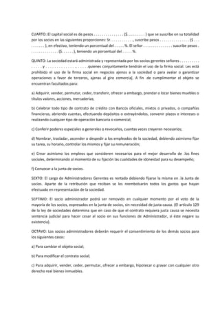 Este documento presenta un modelo de contrato de sociedad colectiva. Establece cláusulas como el nombre y domicilio de la sociedad, la duración de la misma, el capital social aportado por cada socio, las funciones administrativas de los socios gerentes, la distribución de ganancias y pérdidas, y disposiciones en caso de incapacidad o fallecimiento de un socio. El contrato provee detalles sobre la estructura y gobernanza de la sociedad colectiva.