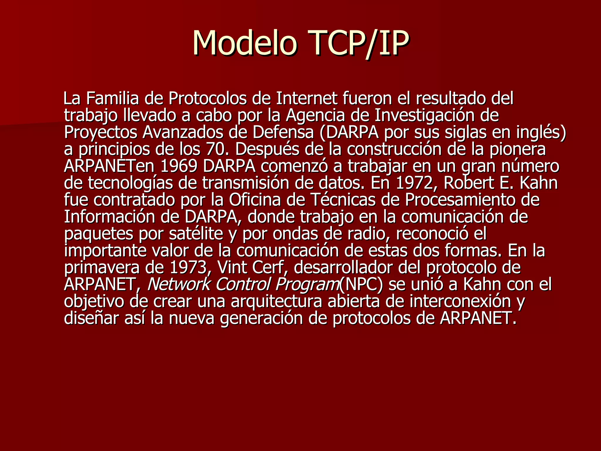 El documento describe el modelo TCP/IP y cómo funciona. TCP/IP fue desarrollado originalmente por DARPA en los años 70 para permitir la comunicación entre redes de computadoras. Consiste en cuatro capas (aplicación, transporte, internet e interfaz de red) que especifican cómo los datos son empaquetados y enviados a través de redes. TCP/IP hace posible la comunicación entre sistemas operativos y hardware incompatibles al enviar datos en paquetes con cabeceras que contienen información de control como la dirección de destino.