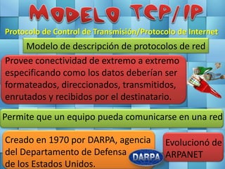 Este documento describe el protocolo TCP/IP y el modelo OSI de redes. Explica que TCP/IP proporciona conectividad de extremo a extremo especificando cómo deben formatearse, dirigirse, transmitirse, enrutarse y recibirse los datos. También describe las capas del modelo OSI y su equivalencia con las capas del modelo TCP/IP. Finalmente, resume las características y evolución del estándar Ethernet para redes de área local.