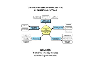 Este documento presenta un modelo para integrar las tecnologías de la información y la comunicación (TIC) al currículo escolar. Propone varias acciones clave como designar un líder en TIC, diseñar un plan estratégico, capacitar a docentes, adquirir hardware y software adecuados, implementar una red escolar y conectividad a Internet, y transformar la enseñanza para desarrollar competencias digitales en los estudiantes. Todo ello forma parte de un proceso gradual para lograr una efectiva integración de las TIC en la educ
