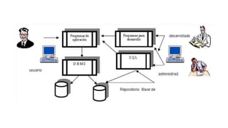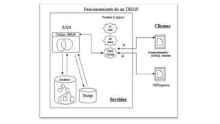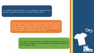 Los modelos de bases de datos son arquitecturas que organizan el acceso a datos, incluyendo distintos tipos como el modelo jerárquico, de red, orientado a objetos y relacional. Cada modelo presenta características únicas y aplicaciones en diferentes contextos, desde bases de datos documentales hasta sistemas de información geográfica. Los sistemas de gestión de bases de datos (SGBD) permiten almacenar, manipular y mantener la integridad de la información, ofreciendo funcionalidades para el acceso y control de datos.