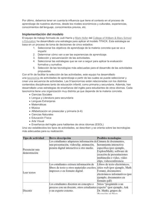 El documento describe el Modelo TPACK, el cual integra los conocimientos pedagógicos, disciplinares y tecnológicos de los docentes. Explica las 7 áreas de conocimiento que comprende el modelo y cómo se relacionan. También describe la implementación del modelo propuesta por Judi Harris y Mark Hofer, la cual consiste en un proceso de 5 etapas para la selección de objetivos, actividades, evaluación y tecnologías para una lección. Finalmente, explica que han desarrollado taxonomías de actividades para diferentes materias y criterios de evalu