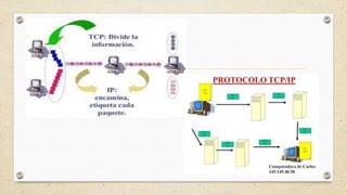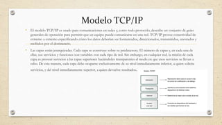 El documento describe el modelo TCP/IP, el cual se divide en 5 capas principales (aplicación, transporte, enrutamiento, enlace y física) y provee conectividad de extremo a extremo especificando cómo los datos deberían ser formateados, direccionados, transmitidos, enrutados y recibidos. Cada capa se construye sobre la anterior y se ocupa exclusivamente de comunicarse con las capas adyacentes. El modelo TCP/IP es similar al modelo OSI de 7 capas pero se enfoca más en la interconexión de redes que en protocolos