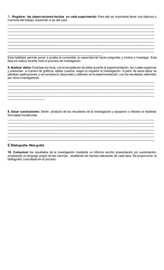 El documento describe los pasos de la metodología del trabajo científico, incluyendo: 1) definir una situación problema y pregunta de investigación, 2) establecer una hipótesis, 3) justificar la investigación, 4) describir antecedentes, 5) formular un objetivo, 6) describir un plan metodológico, 7) registrar observaciones, 8) analizar datos, 9) sacar conclusiones, y 10) comunicar los resultados. El objetivo es motivar el desarrollo de habilidades investigativas aplicando estos pasos sistemáticos