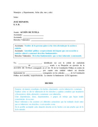 El documento presenta una acción de tutela contra una autoridad pública por la presunta vulneración de derechos fundamentales. El accionante solicita la protección de sus derechos a la dignidad y al debido proceso luego de no haber recibido una respuesta oportuna a una petición. Como pruebas, presenta comunicaciones relacionadas con el caso.