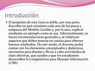 Este documento presenta el Modelo Gavilán, un método para desarrollar la competencia de manejo de información en estudiantes. El modelo consta de 4 pasos: 1) definir el problema e investigación, 2) buscar fuentes, 3) analizar la información, y 4) sintetizar los resultados. Cada paso tiene varios subpasos. El documento explica cada parte del modelo y proporciona un ejemplo para ilustrar cómo aplicarlo.