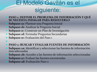 El documento describe el Modelo Gavilán, un proceso de 4 pasos para realizar investigaciones. El Paso 1 involucra definir el problema de información mediante el planteamiento de una Pregunta Inicial y Preguntas Secundarias. El Paso 2 implica buscar y evaluar fuentes de información. El Paso 3 consiste en analizar y responder las Preguntas Secundarias. Finalmente, el Paso 4 sintetiza los hallazgos para resolver la Pregunta Inicial. Cada paso incluye la evaluación del progreso.