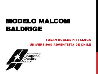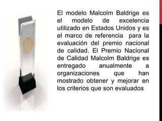 El modelo Malcolm Baldrige es un marco de referencia utilizado en Estados Unidos para evaluar la calidad y excelencia en organizaciones. Considera siete criterios clave: liderazgo, planificación estratégica, enfoque en clientes y mercado, información y análisis, enfoque en recursos humanos, gestión de procesos y resultados. El modelo evalúa estos criterios a través de subcriterios y conceptos para determinar la efectividad de una organización. El modelo ha demostrado estimular la mejora continua de la calidad en las empresas.