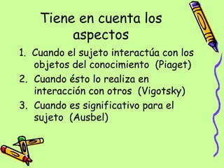 El modelo constructivista mantiene que el ser humano construye su propio conocimiento a través de la interacción con su entorno y otros individuos. Este modelo tiene en cuenta cómo el sujeto aprende al interactuar con objetos, otras personas y cuando el aprendizaje es significativo. Un método efectivo para aplicar este modelo es el proyecto, donde los estudiantes interactúan en situaciones concretas y significativas. El rol del orientador cambia a ser un facilitador que apoya a los estudiantes.