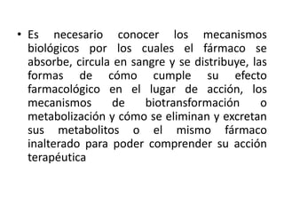 El documento describe los parámetros farmacocinéticos y modelos compartimentales. Explica los procesos de absorción, distribución, metabolización y excreción de los fármacos y cómo se pueden representar y analizar mediante curvas de concentración plasmática, parámetros como Cmax, AUC, vida media y modelos matemáticos como los modelos compartimentales y fisiológicos.