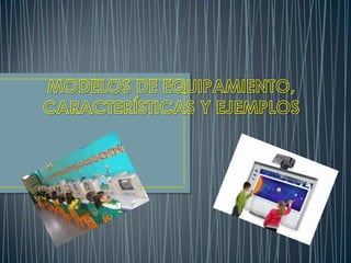 El documento describe diferentes modelos de equipamiento tecnológico para aulas, incluyendo un modelo para primaria que moderniza el equipo existente y uno para secundaria. Se detallan tres modelos principales: un aula de medios base con computadora, proyector e impresora; un modelo uno a uno donde cada estudiante y maestro tienen su propio dispositivo; y un modelo uno a treinta donde los estudiantes comparten equipos organizados en equipos.