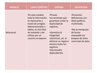 El documento describe las características básicas de una base de datos relacional, incluyendo las tablas (relaciones), tuplas (filas), atributos, dominios y el grado de una relación. Explica que una relación representa una entidad como oficinas o empleados, con atributos como número, dirección y teléfono; cada fila contiene valores para los atributos; y el grado es el número de atributos.