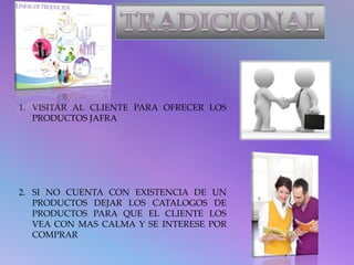 El documento describe dos modelos de negocio para la venta de productos Jafra: 1) un modelo tradicional que involucra visitar al cliente, dejar catálogos, tomar pedidos, entregarlos y determinar la forma de pago; y 2) un modelo de economía digital que implica crear un sitio web para mostrar los productos, permitir que los clientes exploren, compren y paguen en línea, y enviar los productos.