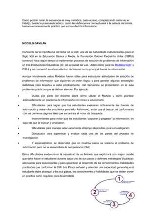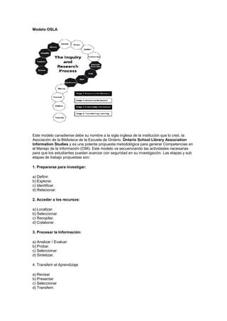 Este documento describe varios modelos para el desarrollo de competencias en el manejo de la información. El Modelo OSLA propone cuatro etapas secuenciales para la investigación. El Modelo Gavilán fue creado para abordar problemas prácticos que surgían al aplicar otros modelos. Consiste en cuatro pasos con subpasos detallados. El Modelo Big6 se basa en el desarrollo de habilidades a través de la solución de problemas de información. El Modelo Stripling propone once pasos para proyectos de investigación.