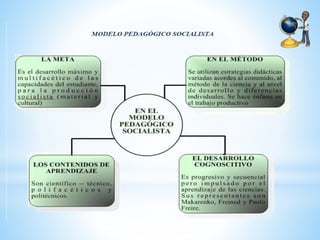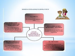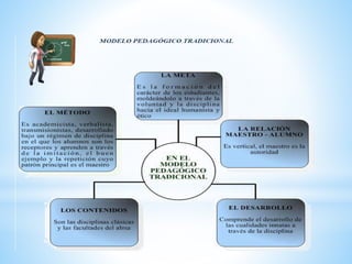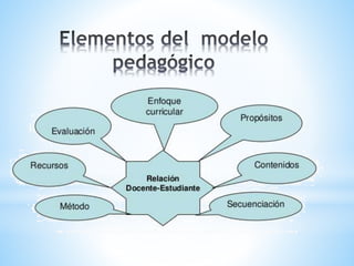El documento habla sobre la educación y los modelos pedagógicos. Define la educación como la construcción mental que busca cumplir los objetivos sociales e institucionales para formar al tipo de persona que se quiere en un momento histórico. Luego describe que la educación busca regular el proceso educativo definiendo qué, cómo, cuándo y cómo enseñar y evaluar. Finalmente, menciona cinco modelos pedagógicos: tradicional, conductista, romántico, desarrollista y socialista.