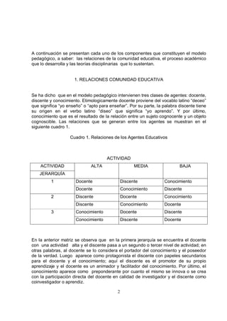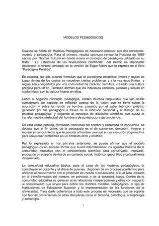 El documento describe los conceptos de modelo y pedagogía, y tres modelos pedagógicos (didáctico, cognitivo y cientificista) y sus características. El modelo pedagógico se define como un sistema formal que busca interrelacionar a los agentes educativos (docentes, discentes y conocimiento) para conservar, innovar o producir conocimiento en un contexto determinado. Los modelos se diferencian por su énfasis en la enseñabilidad, educabilidad o investigabilidad del conocimiento.