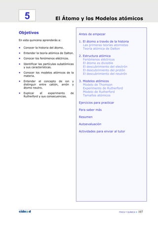 Este documento describe la historia del átomo y los modelos atómicos. Comienza con las primeras teorías atomistas de los filósofos griegos como Leucipo y Demócrito, y luego la teoría atómica de Dalton en el siglo XIX. Luego detalla el descubrimiento de las partículas subatómicas como el electrón, protón y neutrón a principios del siglo XX. Finalmente, introduce los primeros modelos atómicos como el modelo de Thomson y el experimento y modelo de Rutherford, que llevaron al entendimiento