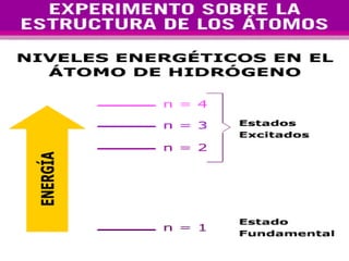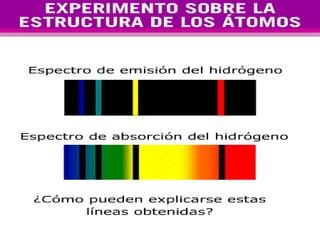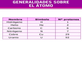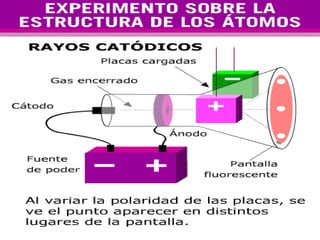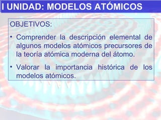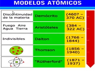 El documento presenta los modelos atómicos desde la antigüedad hasta el modelo actual. Explica el modelo de Thomson basado en los rayos catódicos, el modelo planetario de Rutherford con el núcleo central y las órbitas de electrones, y el modelo cuántico de Bohr con los estados estacionarios de los electrones. También define conceptos como número atómico, número másico, isótopos, y masa atómica. Incluye preguntas y ejercicios para comprender y aplicar estos conceptos.