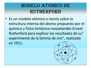 El documento resume cuatro modelos atómicos históricos: el modelo de Rutherford propuso que el átomo consiste en un núcleo denso rodeado por electrones; el modelo de Thomson propuso que los electrones se distribuyen uniformemente en el átomo; el modelo de Dalton fue el primero en proponer que la materia está compuesta de átomos indivisibles que se combinan en proporciones fijas; y el modelo de Thomson combinó las ideas de Dalton con la evidencia de los rayos catódicos.